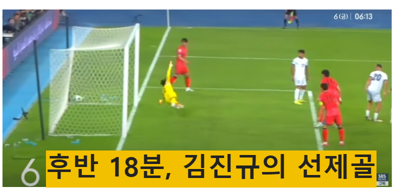 설용우가 오른쪽 측면으로 이강인에게 건네자, 이강인이 페널티 박스 안에서 김진규에서 패스했고 김진규는 오른발 슈팅으로 첫 득점을 하게 되었습니다.