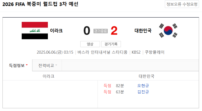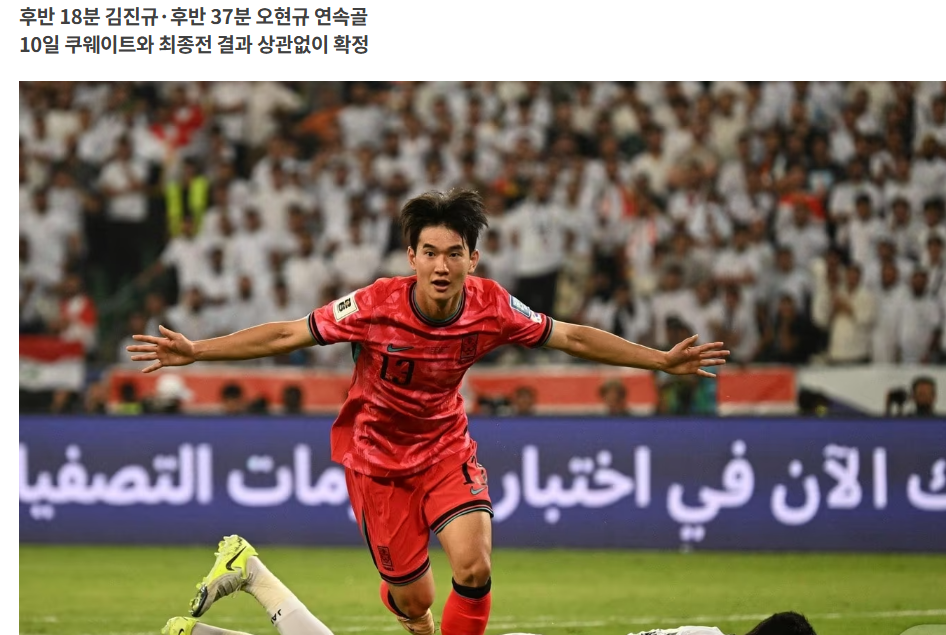 황인범의 절묘한 패스를 받은 전진우가 크로스를 올렸고 이를 후반 38분 오현규가 골을 밀어 넣었습니다 오현규는 이라크전 2경기 연속골이자 A매치 3호 골을 터뜨렸습니다. 교체 투입된 전진우와 오현규의 돋보이는 골이었습니다.